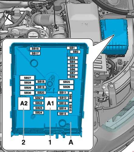 | 27 | 30 | Реле стартера 1 -J906- Реле стартера 2 -J907- (с ноября 2014 г.) |