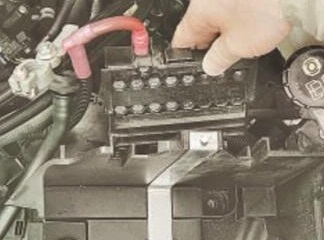 Этот блок мощных предохранителей (плавких вставок) расположен сбоку от аккумулятора, подключен к его положительному клемме. Для доступа к схеме предохранителей под капотом Ford Fiesta 5 требуется снять аккумуляторную батарею.