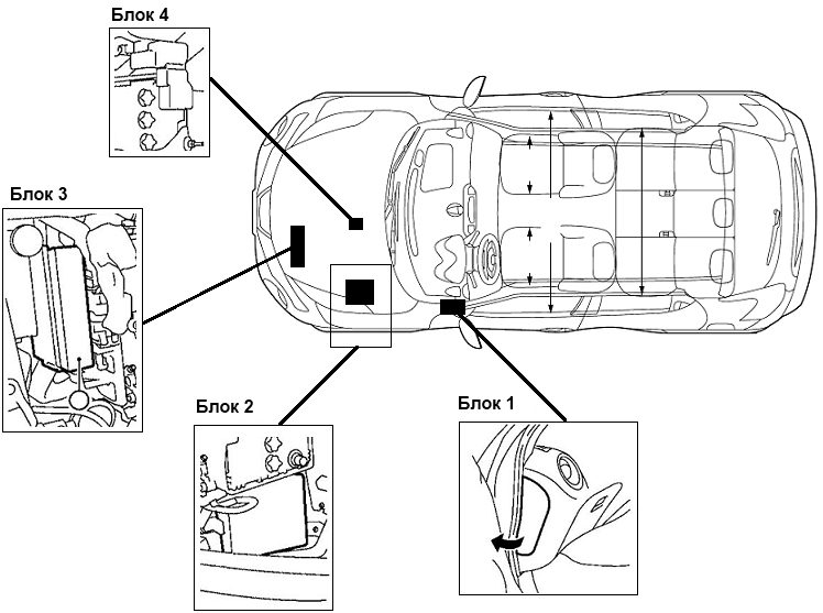 В автомобиле Nissan Juke установлено четыре блока предохранителей и реле: один внутри салона и три в моторном отсеке. Их позиции показаны на общей схеме расположения блоков предохранителей Nissan Juke.