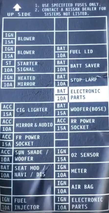 Важно: Nissan Maxima поставлялась в различные регионы мира, включая Северную Америку, Европу и Азию, с различными комплектациями двигателей и опциями. Поэтому расположение блоков предохранителей Nissan Maxima и их конфигурация могут варьироваться. Всегда проверяйте назначение на крышке защитного отсека для точности.