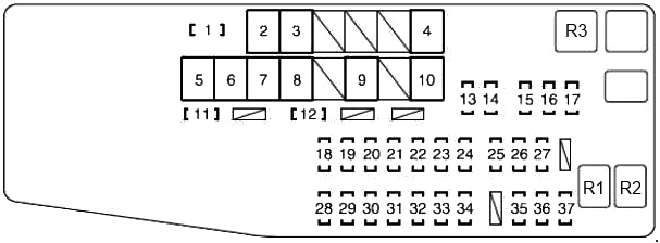 | 1 | 10А ECU-IG1 NO.2 — Очиститель фар, датчик безопасной парковки Toyota, система блокировки передач, обогреватели передних сидений, выключатель задней аудиосистемы, задняя система кондиционирования воздуха, обогреватели задних сидений, электрический привод регулировки задних сидений, система регулировки наклона и высоты рулевой колонки, мультиплексная система связи, аудиосистема, система навигации, зеркало заднего вида в салоне, стеклоочистители и омыватель ветрового стекла, задняя солнцезащитная шторка |