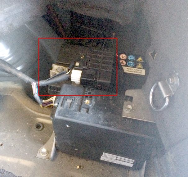 Этот блок силовых предохранителей Toyota Prius 20 установлен в багажнике, непосредственно на плюсовой клемме аккумулятора для защиты высокомощных цепей.